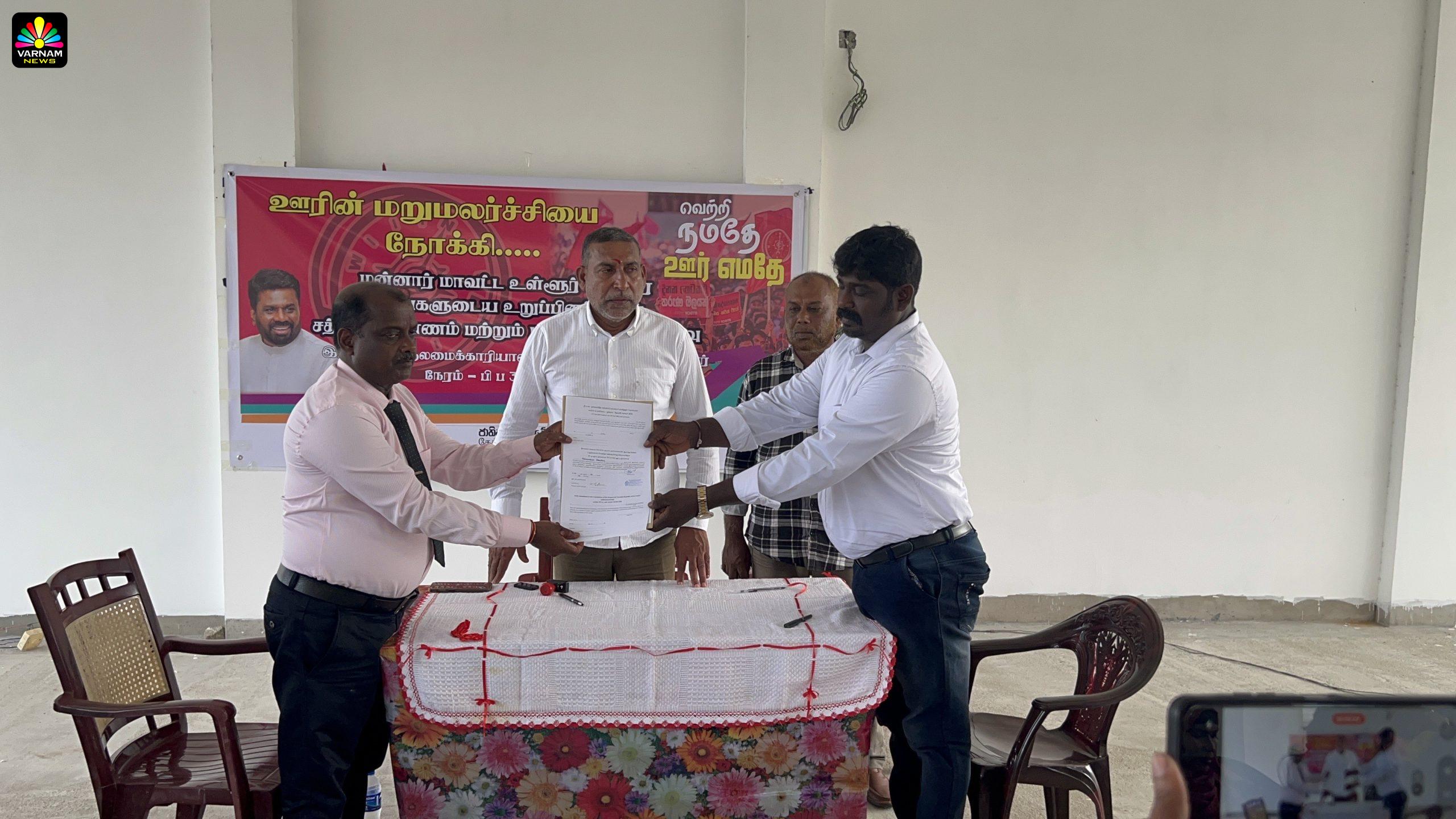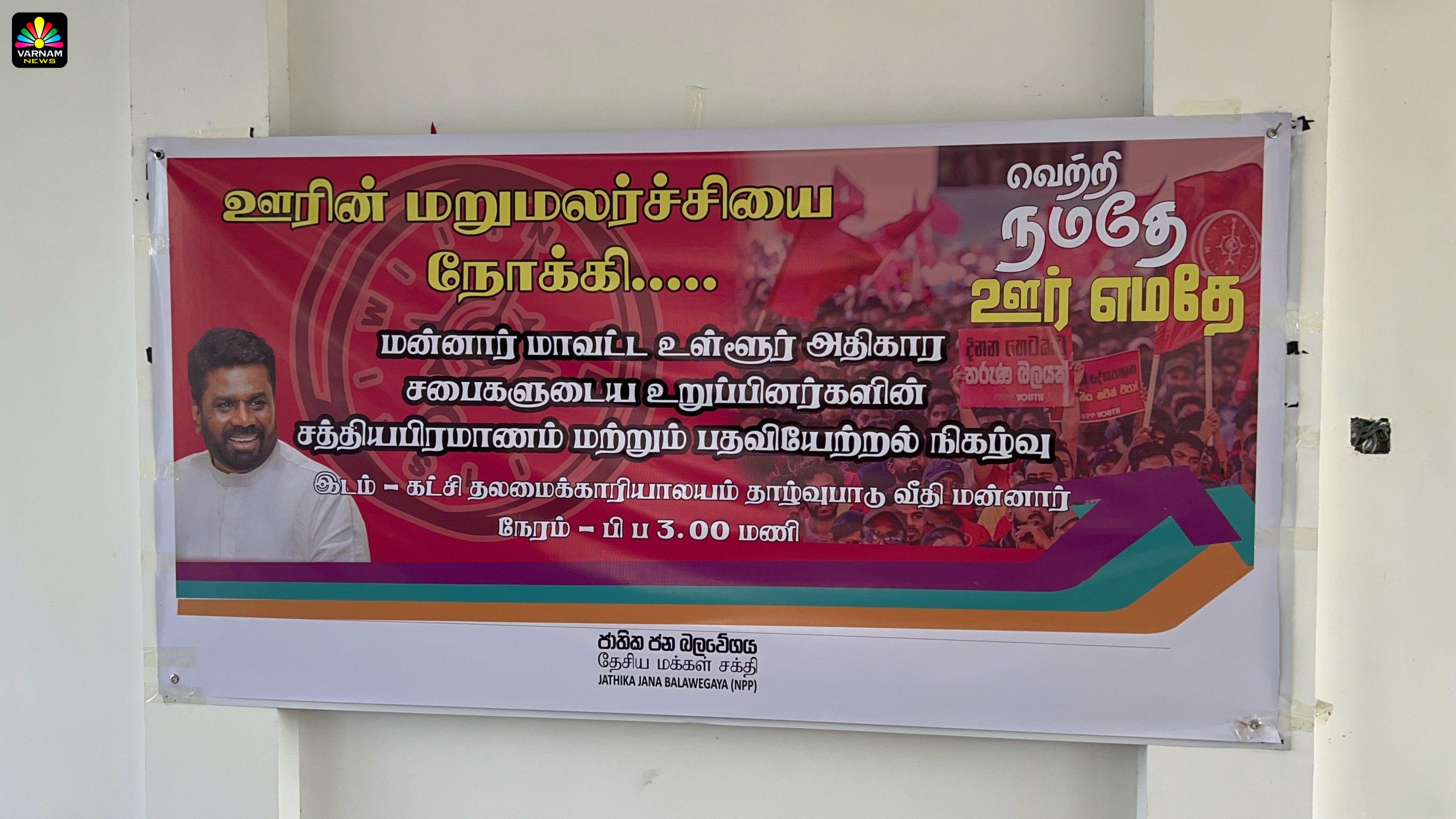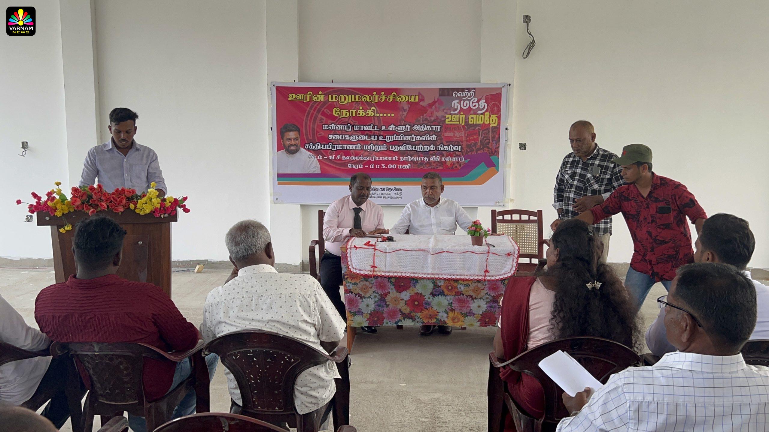 ஊரின் மறுமலர்ச்சியை நோக்கி எனும் தொனிப்பொருளில் மன்னார் நகரசபை,பிரதேச சபை,நானாட்டான் பிரதேச சபை,மாந்தை மேற்கு பிரதேச சபை,முசலி பிரதேச சபை ஆகிய 5 உள்ளூராட்சி சபைகளிலும் தேசிய மக்கள் சக்தி சார்பில் போட்டியிட்டு வெற்றி பெற்ற உறுப்பினர்கள் கூட்டுறவு அபிவிருத்தி பிரதியமைச்சர் உபாலி சமரசிங்க முன்னிலையில், நேற்றையதினம் பதவியேற்றுக் கொண்டதுடன் சத்திய பிரமாணமும் செய்து கொண்டனர்.